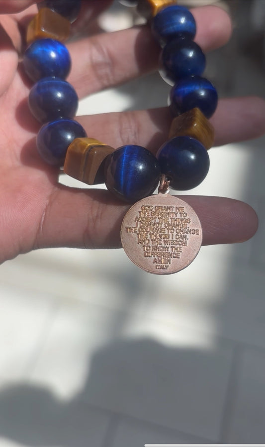 Serenity Prayer Blue Hawk’s Eye and Cubic Tiger’s Eye Bracelet – 12mm Beads