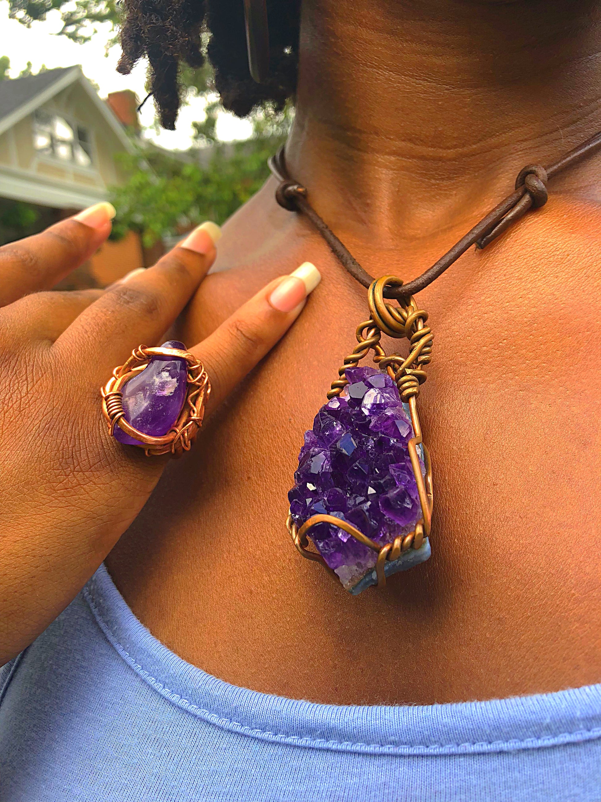 This enchanting Amethyst & Copper Necklace and Ring Set from Planetary Creations is a true embodiment of elegance and spiritual energy. The rich purple hues of the raw amethyst stones radiate healing and protective qualities, while the warm copper setting enhances the stones’ natural beauty and amplifies their energy. The necklace features a striking amethyst pendant, and the matching ring complements it with a refined, minimalist design. Perfect for those who seek to harmonize their style with the calming and grounding properties of amethyst and copper. A set that blends beauty with balance for a holistic touch to any outfit.