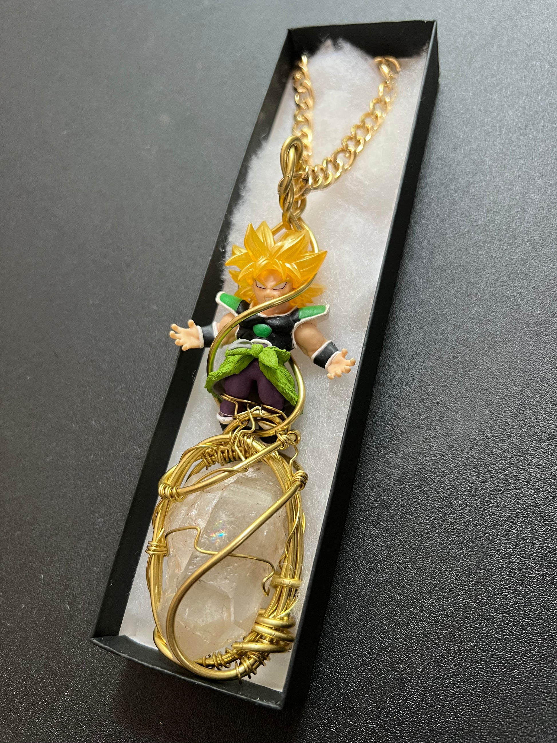 "Unleash the power of the legendary Super Broly with our exclusive custom-made Dragon Ball Necklace! Handcrafted with precision and infused with the energy of clear quartz, this necklace features a mesmerizing Super Broly Dragon Ball pendant wrapped in intricate brass wire. The clear quartz amplifies the wearer's intentions and brings clarity to mind, enhancing focus and determination. Paired with a durable brass link chain, this necklace exudes strength and resilience, embodying the unstoppable force of Super Broly. Whether you're a devoted Dragon Ball fan or simply seeking to add a touch of cosmic power to your ensemble, this necklace is sure to make a statement. Embrace the might of Broly and elevate your style with our Super Broly Dragon Ball Necklace today!"